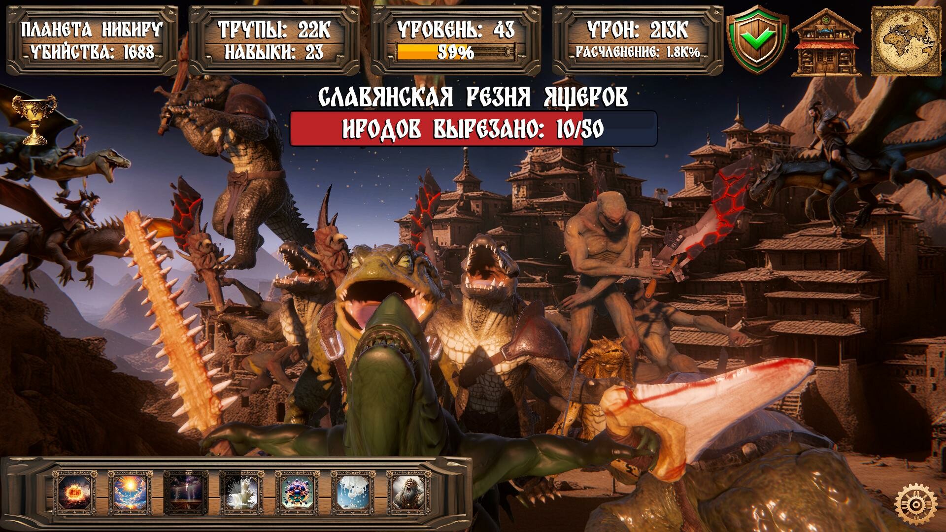 • Убивай ящеров во имя богов и жертвуй их тела, в обмен на благословения! Почувствуй силу водицы байкальской, наполнись мощью молний Перуна, получи как минимум 4 древнеславянских образования, приручи союзников древних русов - динозавров и не только