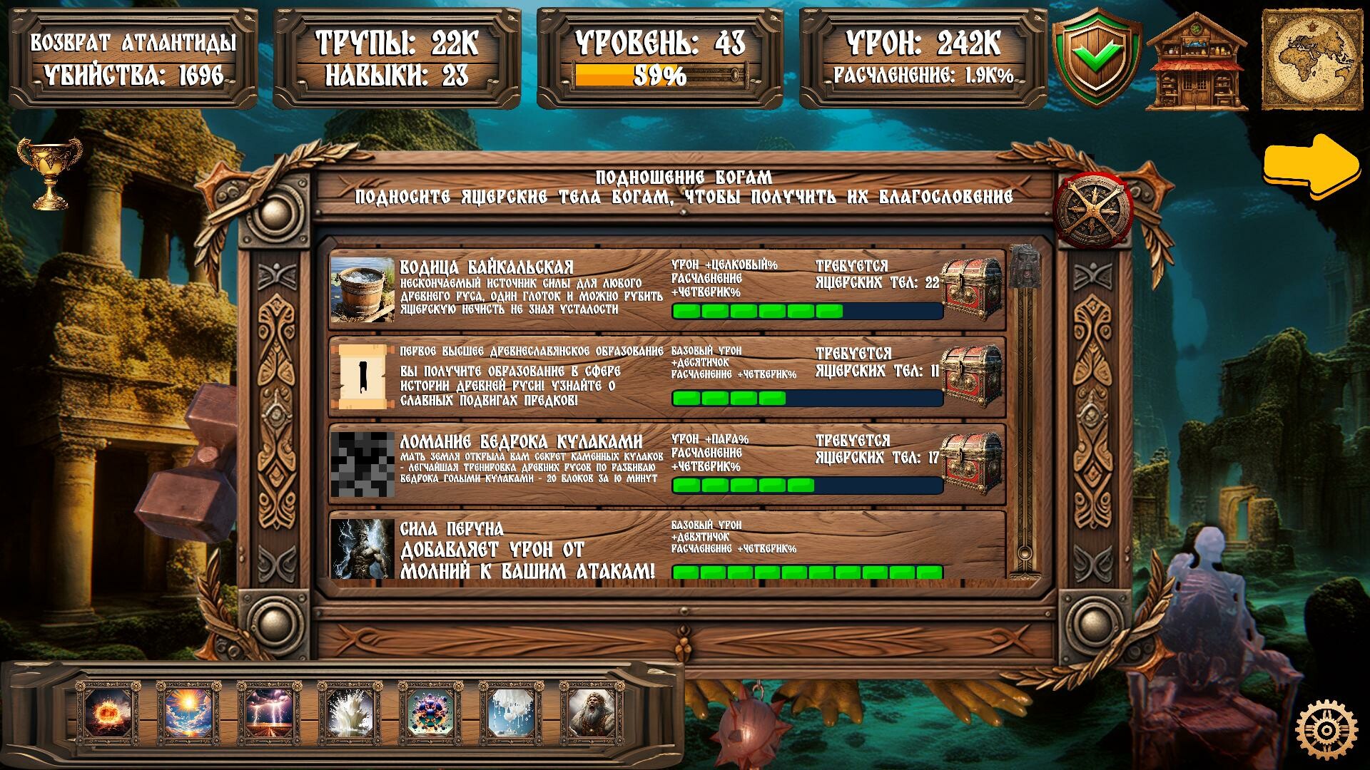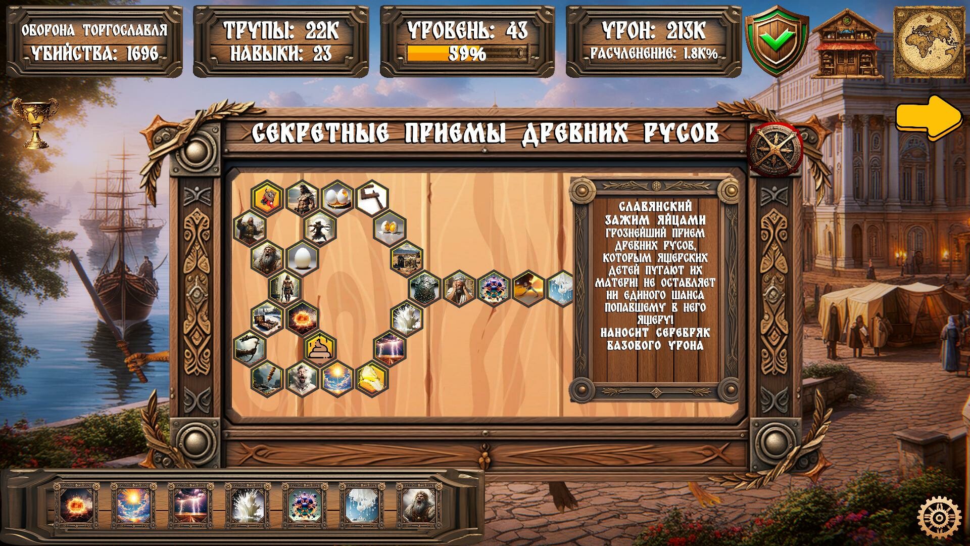 • Дерево прокачки, позволяющее обучиться секретным приемам древних русов, таким как славянский зажим яйцами, славянский прострел сундука, славянский огонь булками, ГОЙДА! На данный момент из древнейших берестяных рукописей открыто 26 секретных приемов