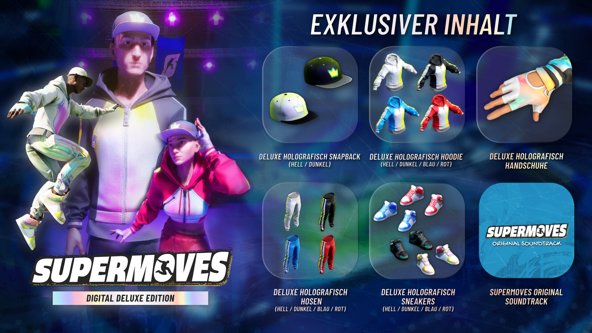 Die Supermoves Digital Deluxe Edition ermöglicht es dir, aus der Menge herauszustechen, mit einem einzigartigen Set von Deluxe-Kosmetika, einschließlich eines holografischen Hoodies, Hosen, Handschuhen, Sneakers und einer Snapback! Enthält auch den offiziellen Supermoves Original Soundtrack.