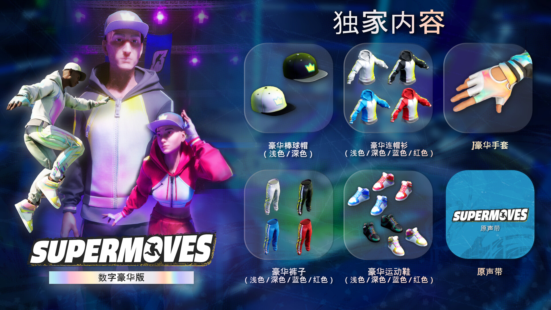 Supermoves 数字豪华版让你可以通过一套独特的豪华化妆品脱颖而出,包括全息连帽衫、裤子、手套、运动鞋和棒球帽!还包括官方的 Supermoves 原声带。
