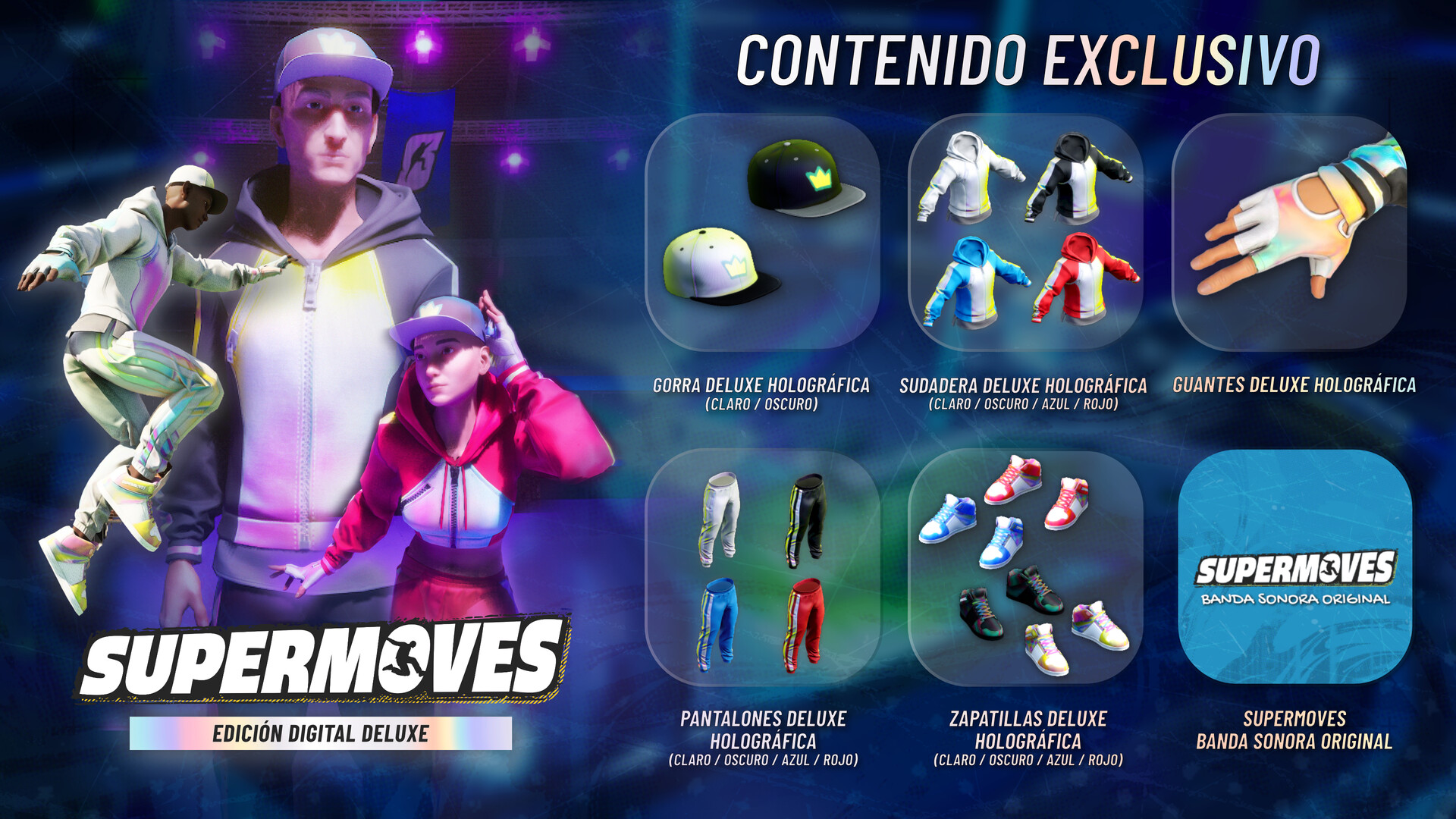 La Edición Digital Deluxe de Supermoves te permite destacar entre la multitud con un conjunto único de cosméticos Deluxe, que incluye una sudadera holográfica, pantalones, guantes, zapatillas y una gorra! También incluye la banda sonora original oficial de Supermoves.