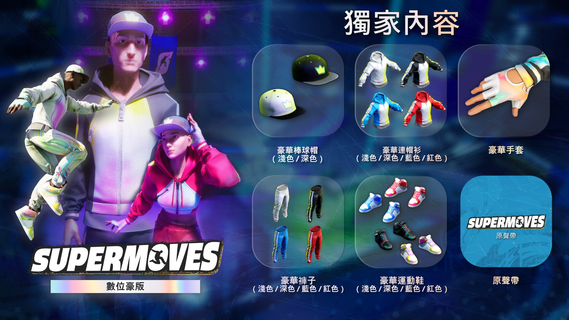 Supermoves 數位豪華版讓你可以通過一套獨特的豪華化妝品脫穎而出,包括全息連帽衫、褲子、手套、運動鞋和棒球帽!還包括官方的 Supermoves 原聲帶。
