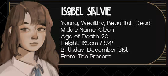 After dying, poisoned for unknown reasons, Isobel finds herself in the afterlife... and on a dangerous mission. Experience a truly unique visual novel full of character, mystery and heart as you point and click your way to unveiling the strange world of Purgatory's many secrets.