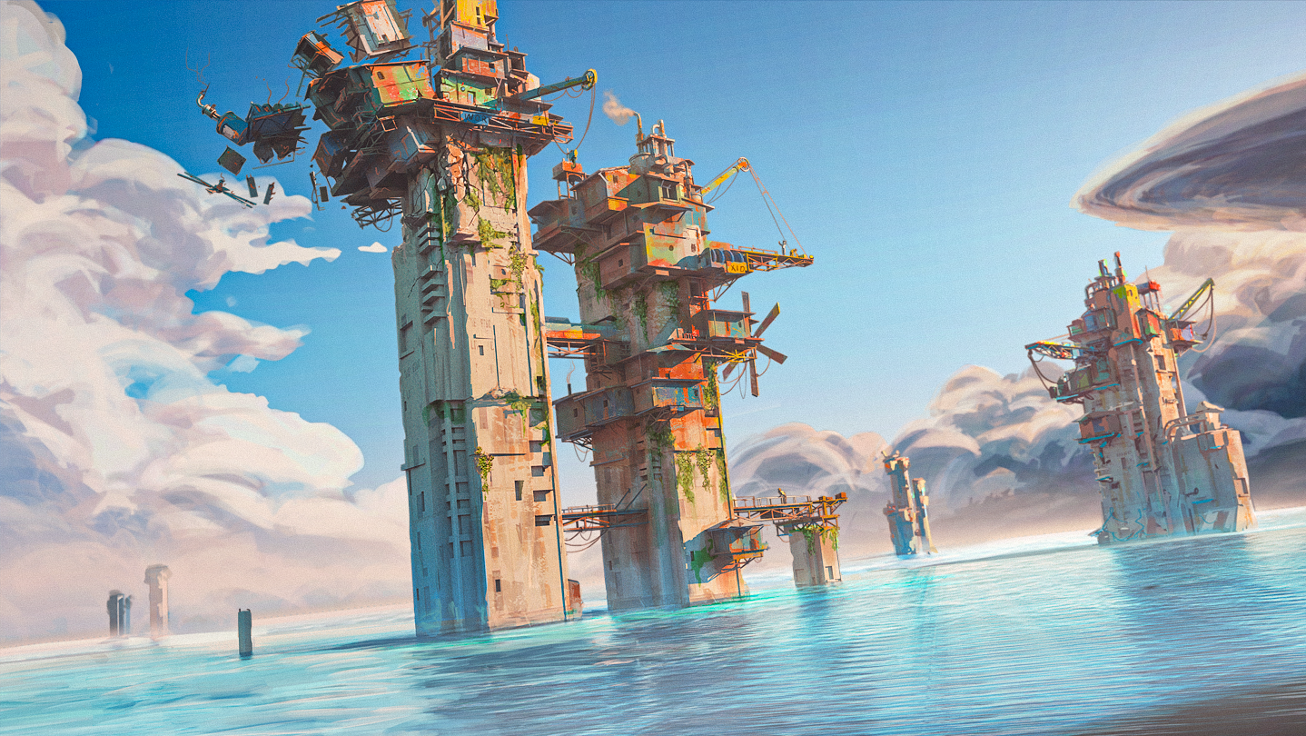 • Send the survivors to scavenge the long-lost world, overtaken by the ocean, for precious resources and building space. Receding tides uncover new areas and resource nodes, reachable with machinery, ladders, explosives, and other means.