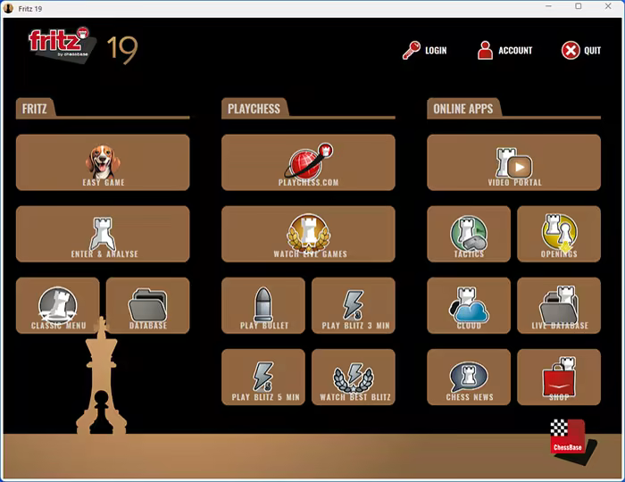 Attacker, coward, swindler or endgame wizard: I'll show you how to win against anyone! After my World Championship victories in 2022 and 2023, I am the reigning Chess Software World Champion and am now looking forward to showing you how to become even stronger against your opponent With my innovative training method, I simulate typical player personalities you know from tournaments and online chess: brash attackers, cautious cowards, passive players. But how do you win against them? Fritz will show you how! And for beautiful attacks, combinations or sacrifices, there are the new ChessBase cards as a reward for you. Practical training that's also a lot of fun. Or let's train openings: you can try out a new repertoire ideas directly in a match against me. And how about the new calculation training for a quick Elo boost? As Fritz19 I can make you play better again.