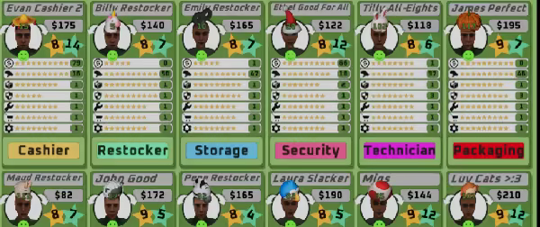 Going solo? No problem, you will be able to hire your own crew. Name them and level them up in 7 different roles: cashier, restock, storage, security, technician, packaging and manufacturing. When assigned to a role they will earn experience in that respective job and earn advantages from it!