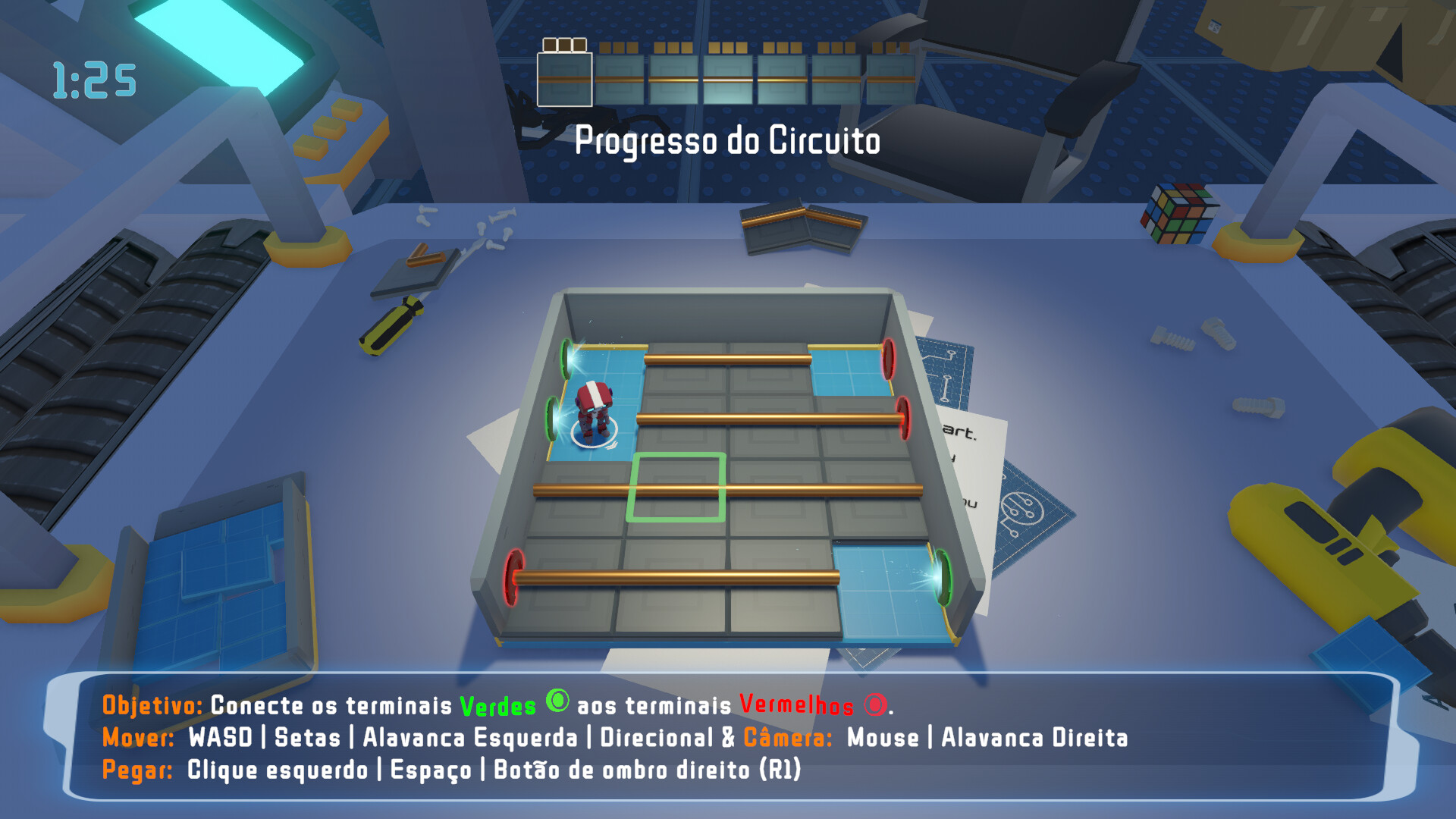 Em Tiny Circuits, você joga como um pequeno robô resolvendo quebra-cabeças elétricos em uma fábrica de eletrônicos.