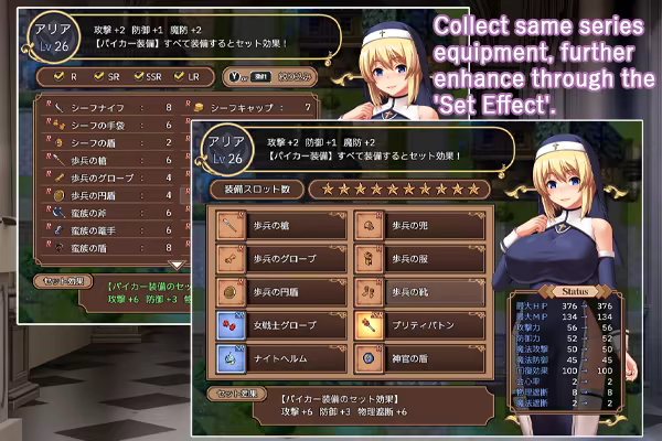 Collecting six items from the same series and equipping them triggers a set effect, further boosting stauts.
