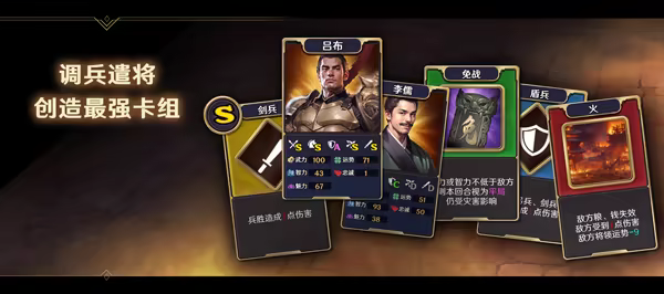 本游戏基础战斗玩法为集换式卡牌战斗,玩家需要在战斗之前派兵遣将4~8名将领,每位将领有武力、智力、魅力三项能力数值,以及运势和忠诚两项动态数值。战斗中通过随机摸取牌堆中的牌,与所派遣的将领们进行出牌的策略搭配。牌分为策牌和兵牌,策牌有灾害、将领单项数值比拼、资源等不同效果,兵牌有枪兵、骑兵、盾兵、弓兵、剑兵等相互克制的兵种,根据不同的阶段响应节奏,双方相应的牌进行比拼。