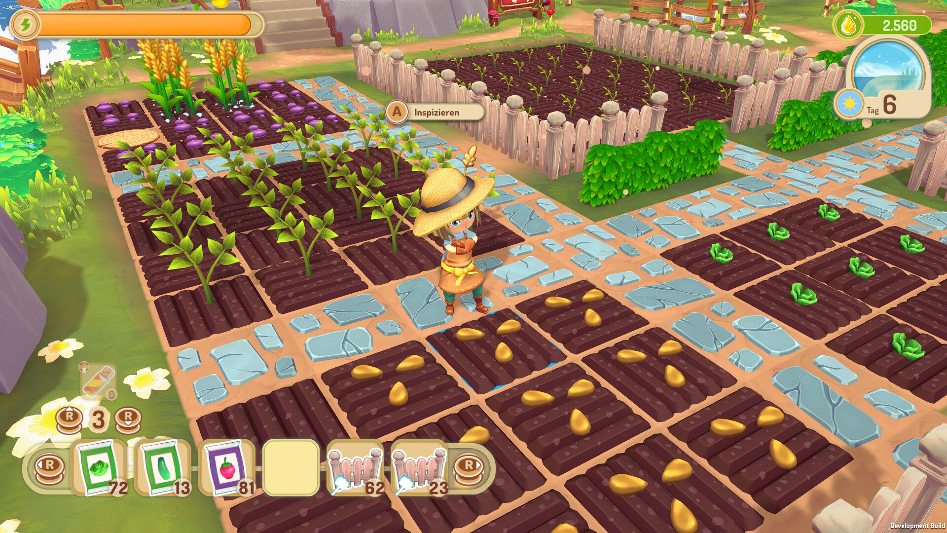 ⚒️ Sammle Ressoursen: Sammle Holz, Steine und Unkraut, um deinen Hof zu verbessern.