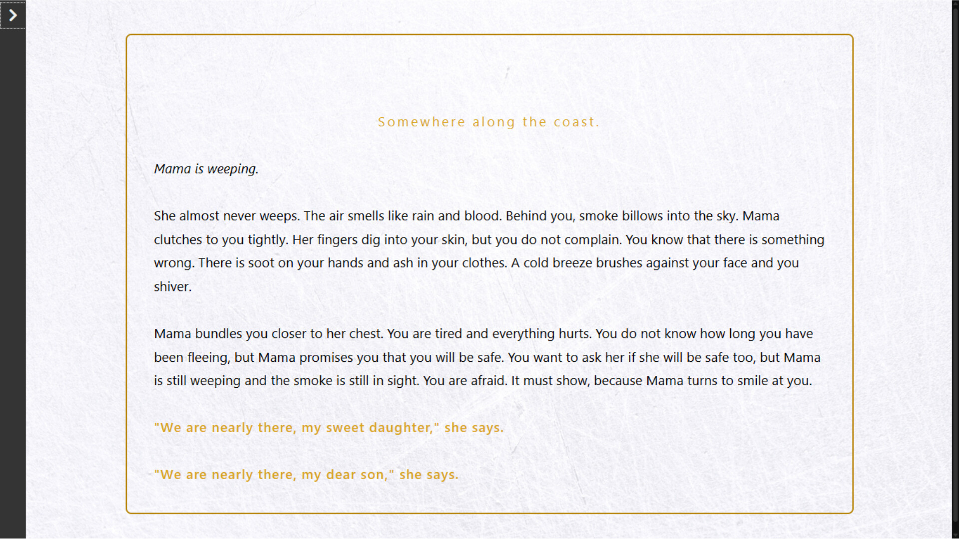 The realms are fractured. A kingdom burns. In this dark fantasy interactive tale, you flee with an exiled prince through a land of treachery and fading deities. Will you shape your fate in blood and fire, or vanish beneath the weight of secrets best left buried?