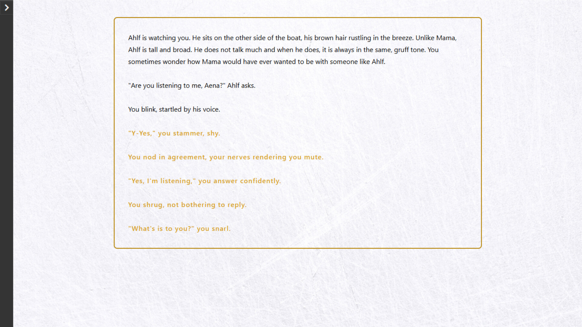 • Dena (gender selectable - he/him, she/her) – A childhood friend turned sea captain. Suave, cunning, and willing to do anything for power.