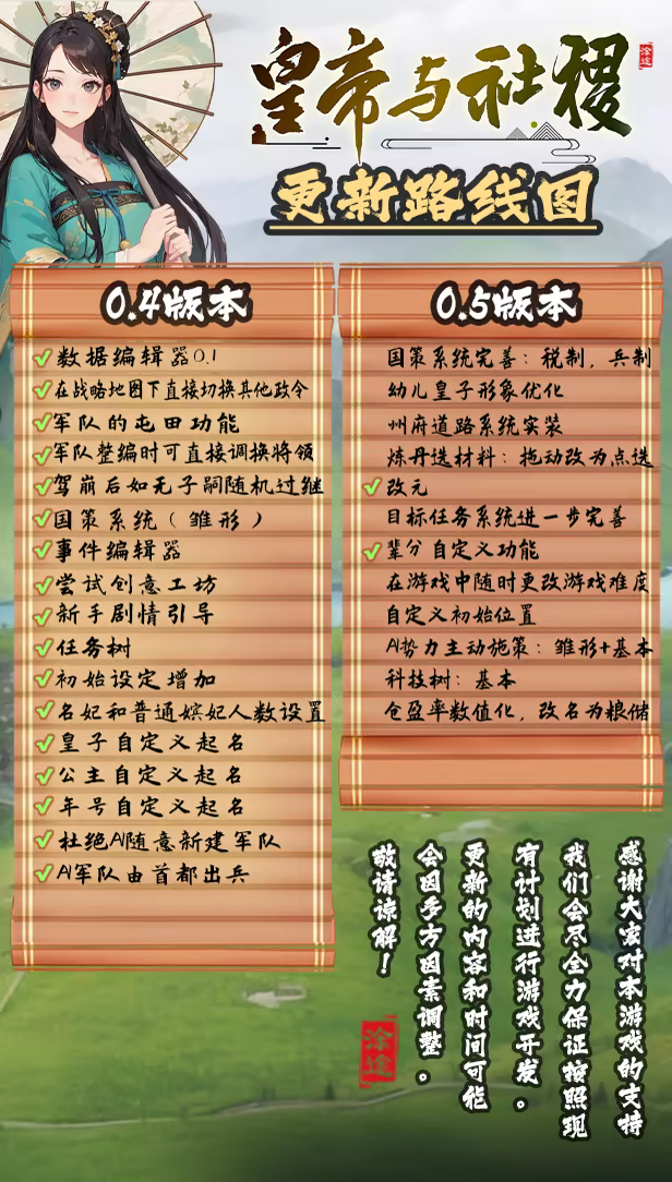 「在未來的開發計劃中,我希望在近期實現包括現在正在完善中的各種建築功能,軍事指令,地方特產等等;