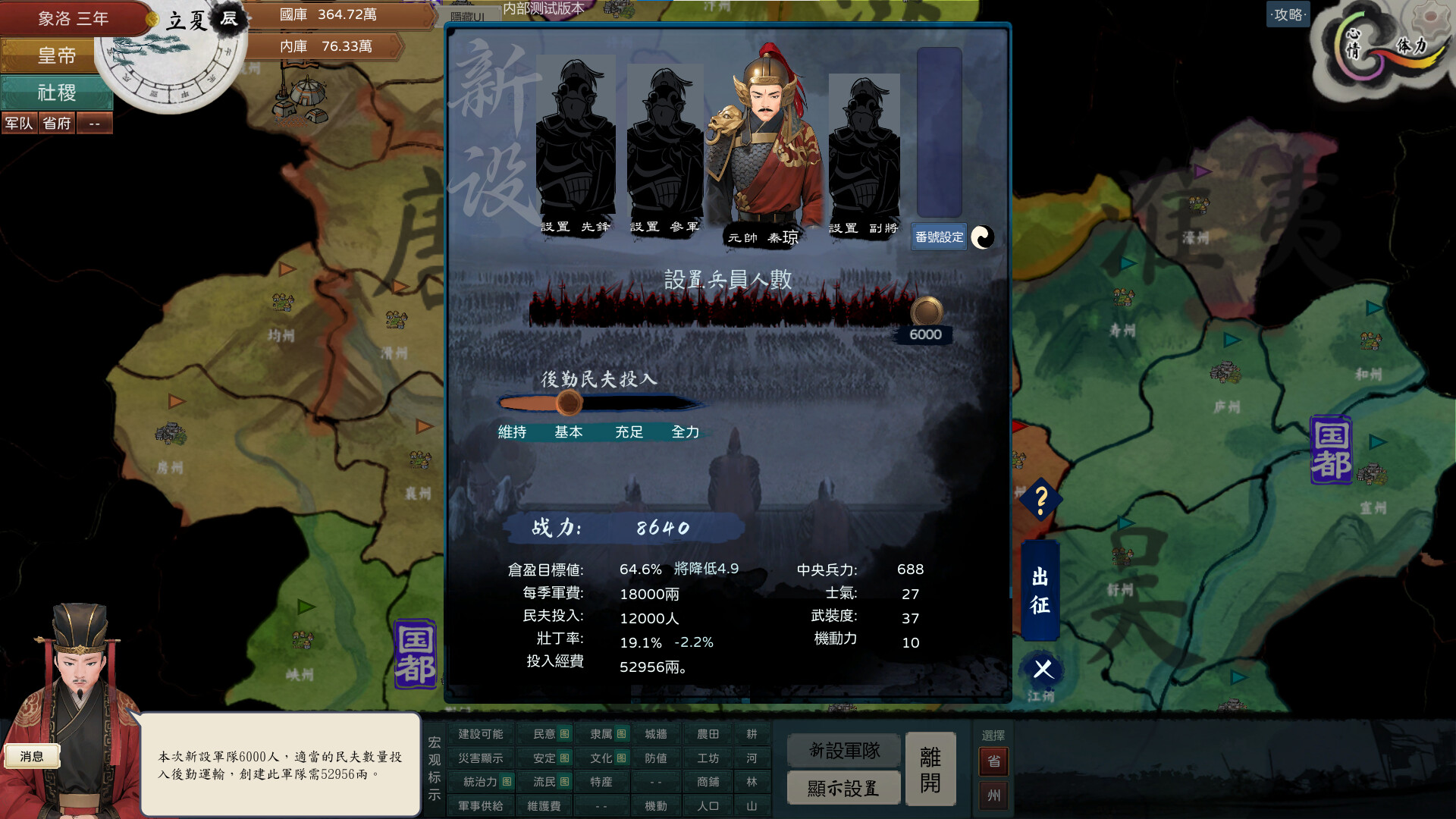 4.當前版本對行政系統增加了省府級別的劃分,這個是可以按照玩家意願去做的,每個省府都可以設立刺史和將軍。
