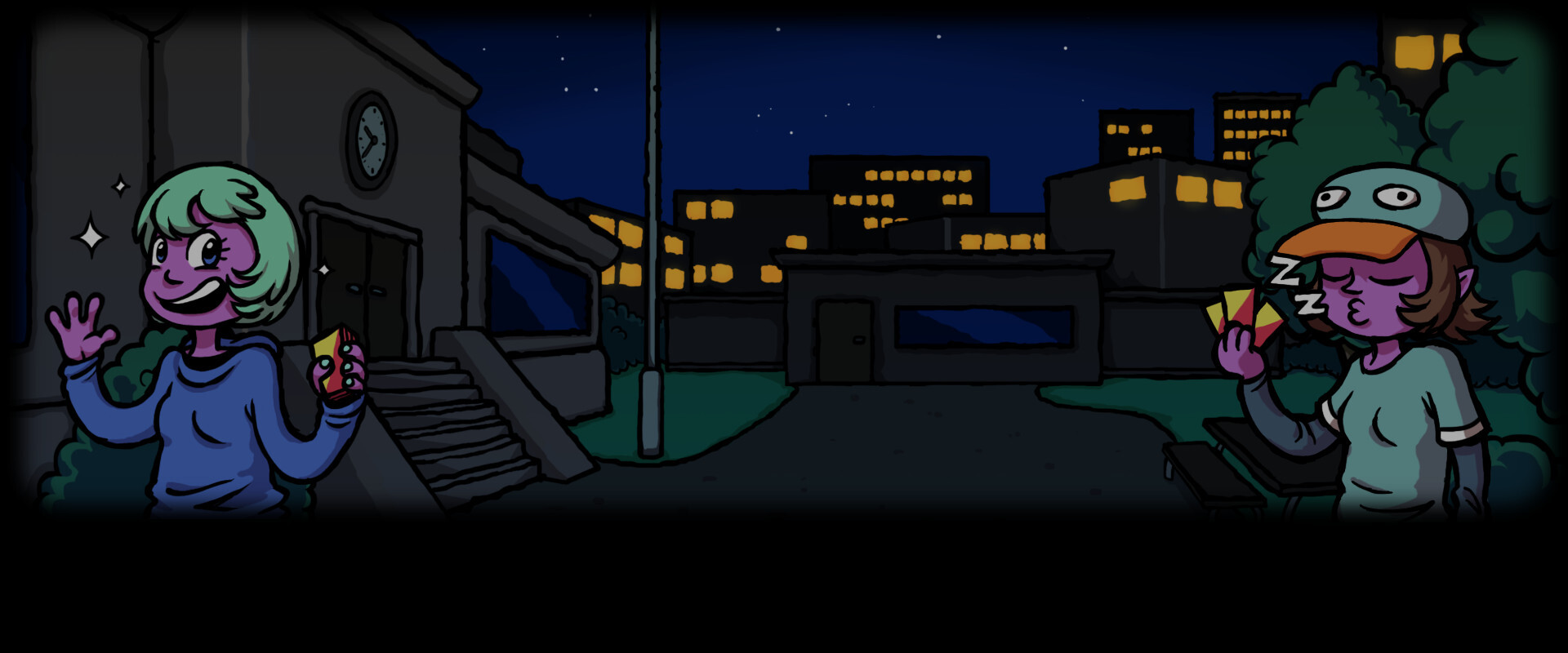 Card City Nights is not a traditional card-trading game. It's an adventure game with zany characters to meet and weird locations to explore. In the center is our new card battle system that breaks away from the fantasy TCG mold with connecting cards to form combos.