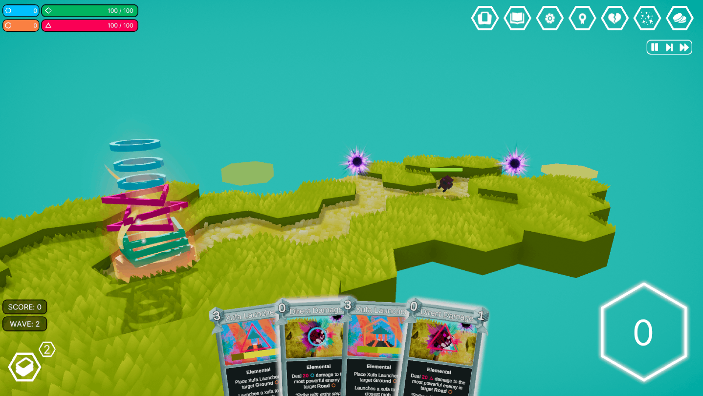 Combine Deck Building and Tower Defense on a hexagonal grid. Expand a procedural map, build towers, and cast spells while managing your hand in real time. Optimize your resources to survive increasingly demanding waves.