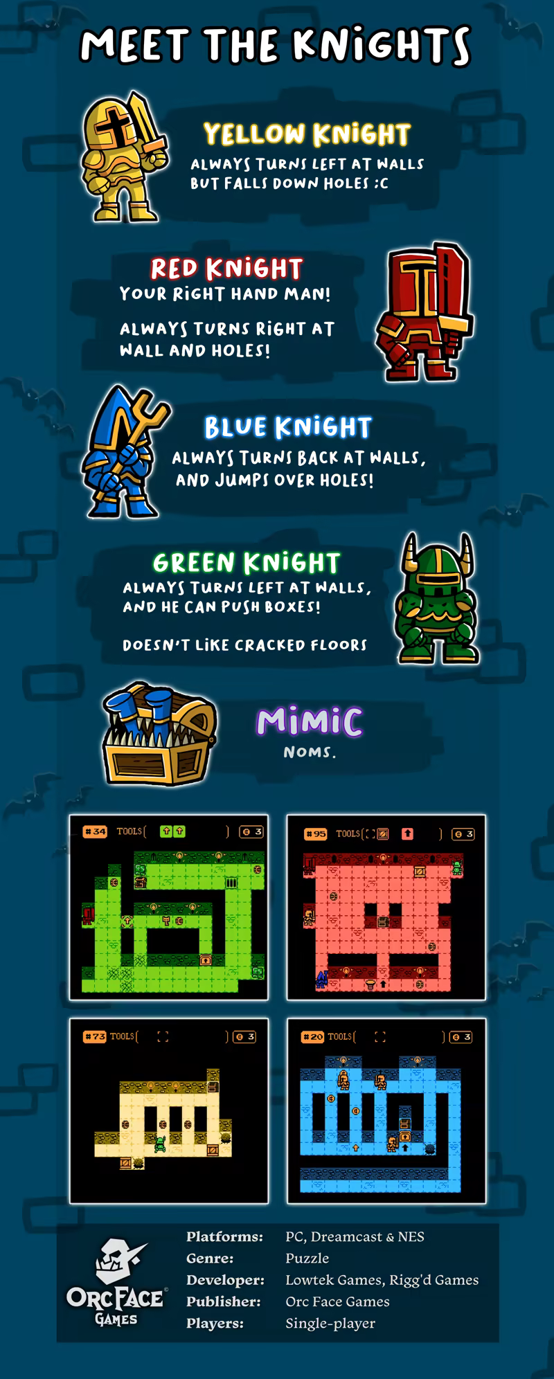 Guide hapless knights to a hungry treasure chest mimic by placing directional tiles, springs, and boxes to avoid obstacles and enemies getting in the way of the knights and their treasure.