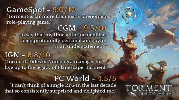 Torment: Tides of Numenera is the thematic successor to Planescape: Torment, one of the most critically acclaimed and beloved role-playing games of all time. Torment: Tides of Numenera is a single-player, isometric, narrative-driven role-playing game set in Monte Cook’s Numenera universe, and brought to you by the creative team behind Planescape: Torment and the award-winning Wasteland 2.