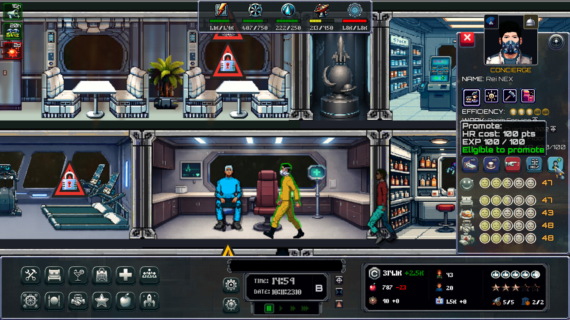 Visitors come from different origins and wealth classes. Earthborn, Lunite, Martian, and Spacer visitors each have their own needs, travel times, and expectations. Economy, Business, and First Class visitors require different standards. Each visitor tracks room, food, recreation, and special satisfaction. These combine into an overall rating. Primary traits such as Casual, Cultural, Foodie, and Thrill Seeker place more weight on specific satisfaction categories.
