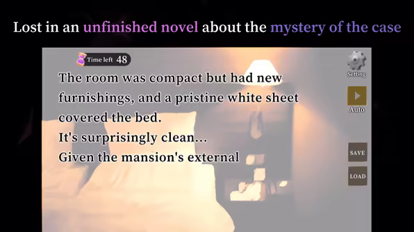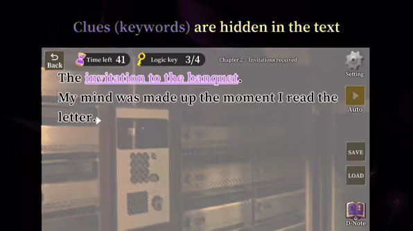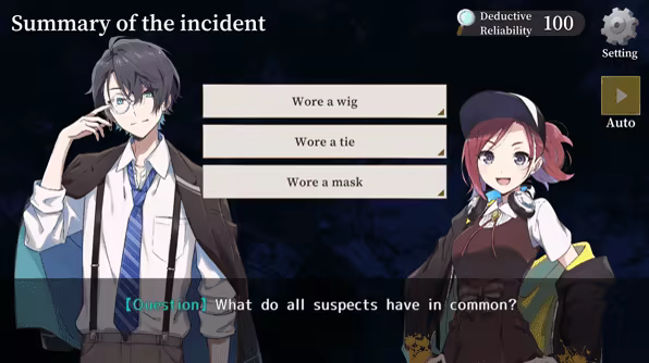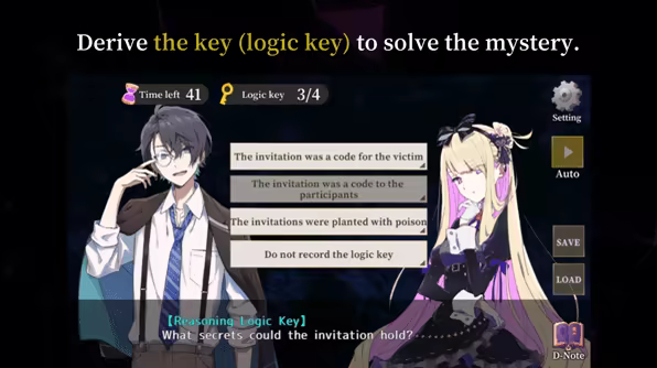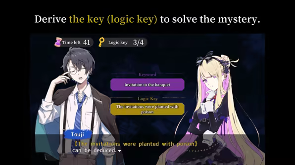 The game is divided into a Reasoning Section and a Solution Section. In the Reasoning Section, you can obtain keys (logic keys) to solve mysteries from mystery novels.