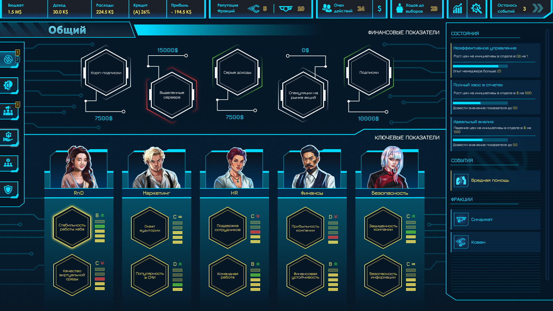 Они объединены в 5 отделов, эффективность каждого из которых выражается в виде 6 обычных и 2 ключевых показателей, менять которые вы сможете с помощью инициатив и нанятых менеджеров.