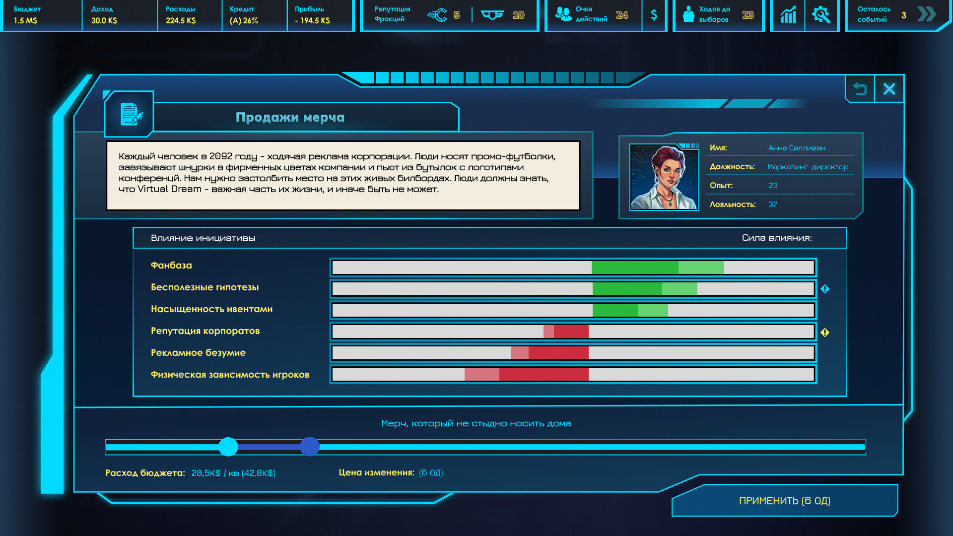 CEO Sim: Cyberpunk - это пошаговая экономическая стратегия об управлении корпорацией в мире киберпанка. Станьте CEO компании Virtual Dreams и под контролем совета директоров попробуйте сохранить свою власть в условиях назревающей войны корпораций.