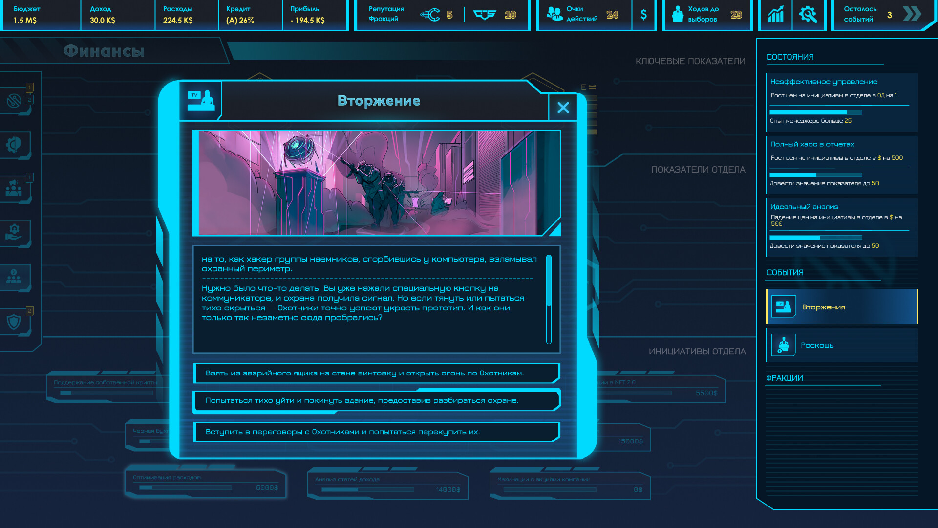 CEO Sim: Cyberpunk - это пошаговая экономическая стратегия об управлении корпорацией в мире киберпанка. Надвигается война корпораций и, помимо забот о развитии компании, рано или поздно придется выбрать свою сторону. Хотя не стоит забывать и о совете директоров - именно эти люди дали вам контроль над компанией и они же могут его и забрать.