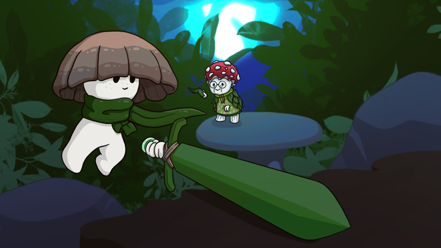 Mushroom Kid's Big Grass Sword is a narrative, physics-based, precision platformer that follows Mica, a little mushroom, on a journey to rescue their village after the residents are captured by a gigantic bird. Meet Grandmashroom as she leads Mica to a mysterious temple to claim the Blade of Grass: a powerful weapon with the ability to pull Mica up ledges and over dangerous obstacles.