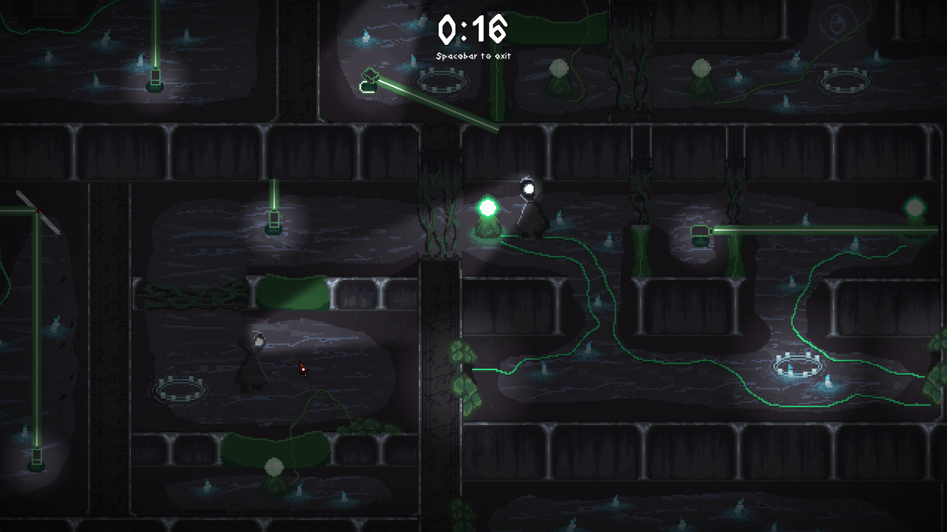 The game world consists of multiple worlds, each of which is made up of several interlinked rooms of which each contains a puzzle. As you solve, actions from previously completed rooms are replayed. Playthroughs of multiple rooms come together to overcome complex challenges. Thinking ahead to create valuable replays is crucial towards progress.