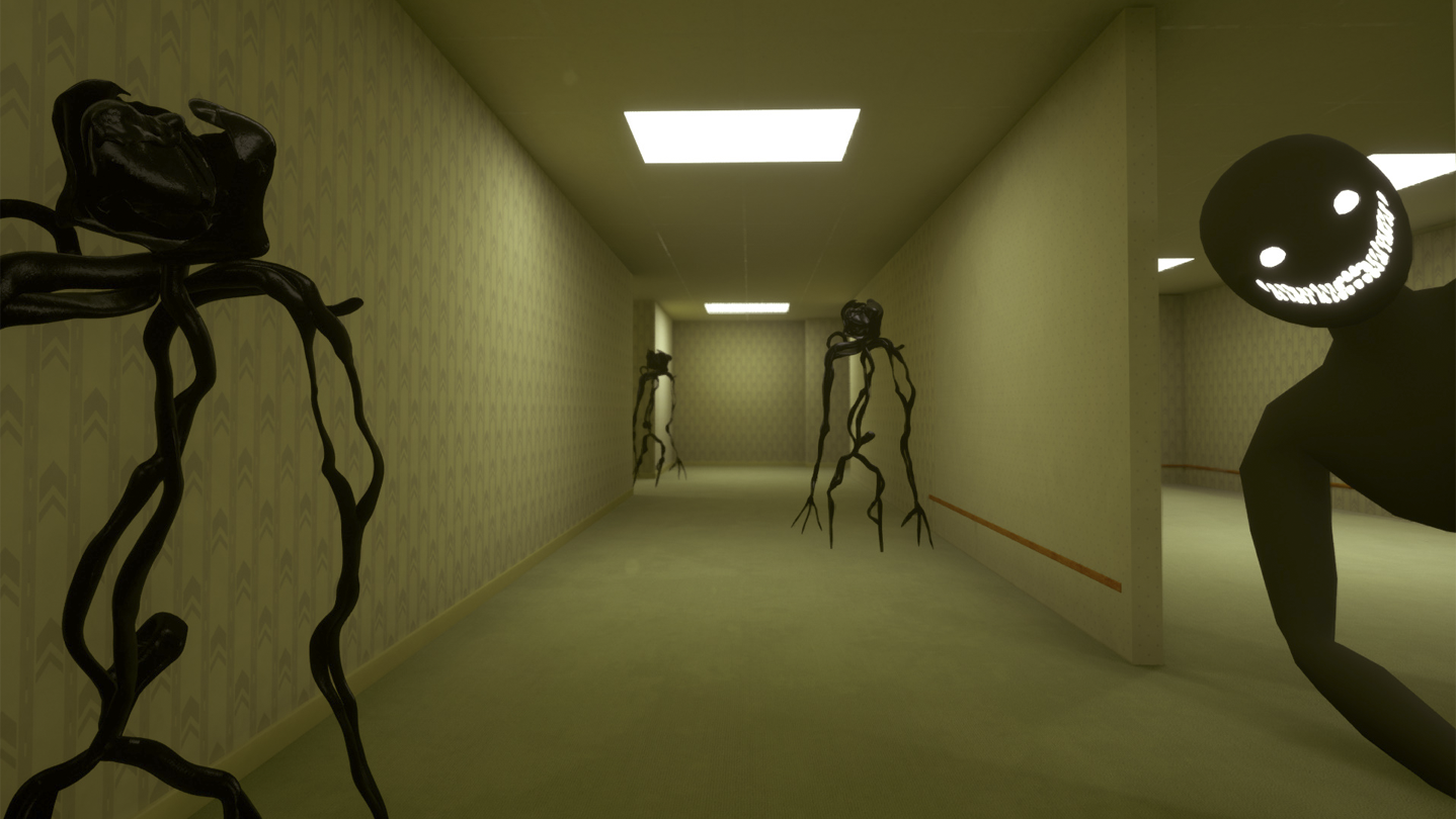 The game offers you a journey through a confusing maze of yellow rooms, endless dark corridors, abandoned offices and other dangerous places Backrooms. You will have to explore spaces that are hard to believe exist. It's hard to say who could have built such a thing and why. There are eight different levels available for you to explore. Each level of this otherworld is fraught with danger, and no matter what surreal place you find yourself in, you have only one goal - to survive and find a way out.