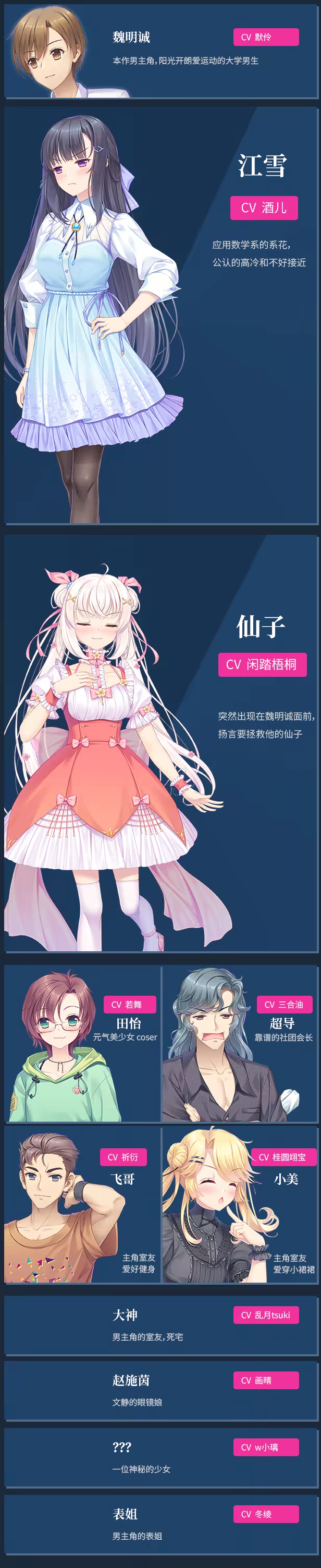 校园恋爱题材的剧情作 Galgame。大二刚开学,魏明诚终于鼓起勇气向系花江雪表白,结果却是被拒绝了。正在他伤心失落之际,在他面前突然出现一位打扮奇特又可爱的女生,自称是仙子,要教魏明诚怎么追女生。这场从心碎开始的旅途,会走向怎样的结局呢?
