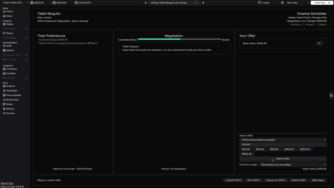 Hire and manage jockeys, trainers, veterinarians and support staff. Staff skills influence horse development, race performance, and overall stable efficiency.