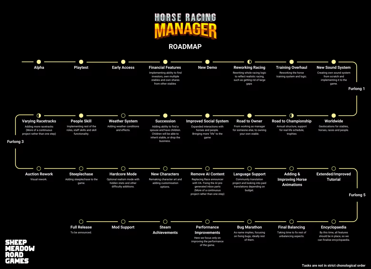 “One of most significant differences gameplay wise is that in Early Access, you begin your journey already as a stable owner, while in full game you will start as a humble manager working for other stable. We still have to expand on current and upcoming features until we can consider HRM to be complete. Refer to "About this game" for a Roadmap of HRM.”