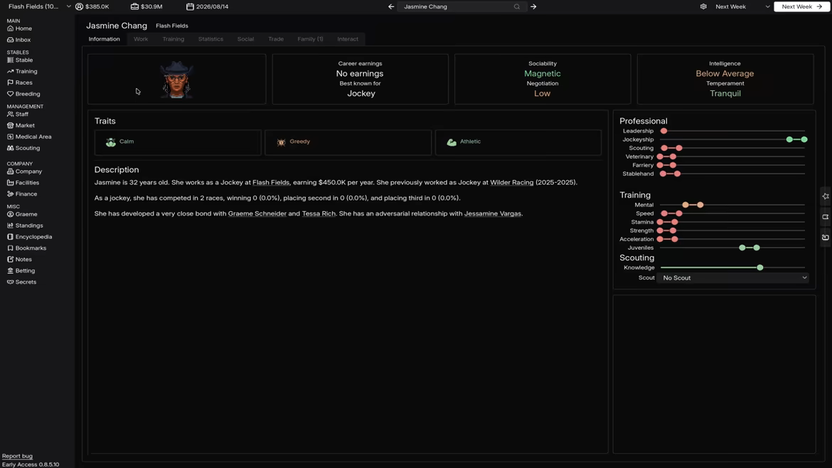 Hire and manage jockeys, trainers, veterinarians and support staff. Staff skills influence horse development, race performance, and overall stable efficiency.