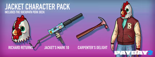 The Hotline Miami 2: Wrong Number Digital Special Edition also includes free access to the Payday 2 "Jacket Character Pack" that includes the character items and weapons below.