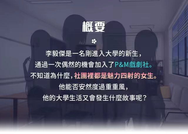 李毅傑是一名剛進入大學的新生, 通過一次偶然的機會加入了P&M戲劇社。 不知道為什麼,社團裡都是魅力四射的女生。 他能否安然度過重重風, 他的大學生活又會發生什麼故事呢?