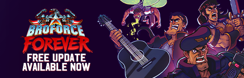 • The Broforce: Deliver your own brand of shock and awe with dozens of bros each with their own unique weaponry and special attacks designed to dispatch freedom across the world.
