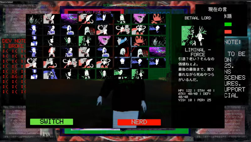 Liminal Voidは、日本のホラー、ノイズ/ブレイクコア・エレクトロニカ、パンク、さらにはThe Beatlesの影響を受け、秘教的で視覚的に鮮烈な体験を生み出します。これは、すべてを知っているわけではないという喜び―安心感や手取り足取りのゲームメカニクスに頼らない自由な体験―を思い出させるものです。ゼロから作り上げられたこのゲームは、他のタイトル以上に敵対的なアプローチであなたに迫ってきます。しかし大丈夫、なぜならこのゲームは、他のどのゲームよりもあなたを愛してくれるからです。あなたには数多くのチャンスが与えられます。