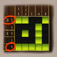 The numbers 2 and 1 signifies there are two filled squares, followed by 1 square in the row. The number 5 means there are 5 squares filled in the row.