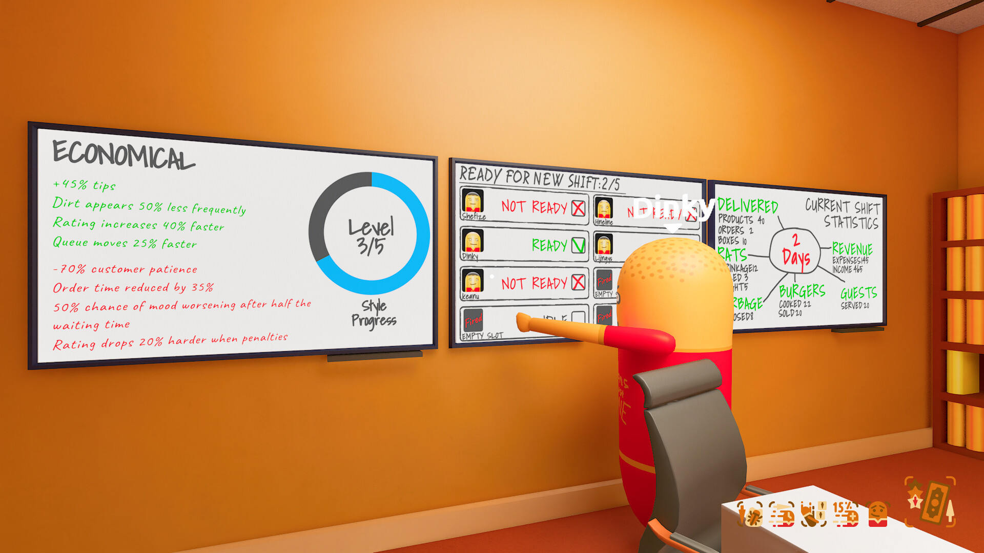 Grill, assemble, and serve quickly—slow service can lead to failure! The faster you work, the more money you make, the higher your rating, and the better the chance of boosting customer mood. The pace increases every day, so efficient teamwork is key!