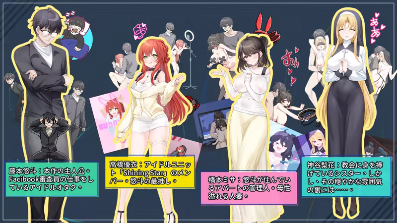 パソコン関係に精通しているアイドルオタク・藤本悠斗は現在無職だ。家に引きこもっているばかりの悠斗だが、このままだと生活もままならないため、彼は渋々SNSプラットフォーム・Facibookの審査員になった。ガイドラインに違反した画像をBANするという一見退屈な作業だが、悠斗はこの仕事をきっかけに、自分の住んでいるアパートの管理人・ミサ、最推しのアイドル・優衣、そして教会シスター・梨花の知らざる一面を知ることになる。