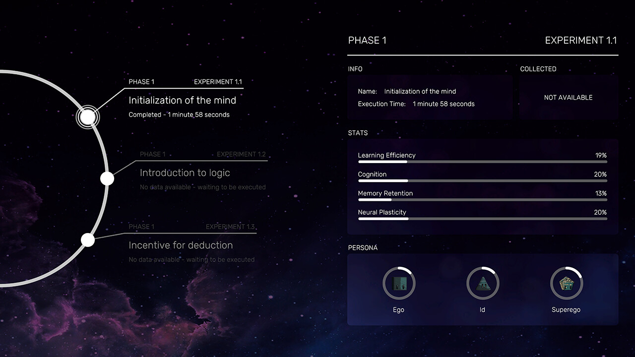 You play with the three interacting agents in the psychic apparatus. Each has its own unique movement mechanics and capabilities. Play with any one of them. Combine their abilities to progress through cognitive training. EGO double-jumps and clings onto walls. ID slingshots through the corridors. SUPEREGO manipulates gravity. The game is built with advanced custom physics to make it extra smooth and fun.