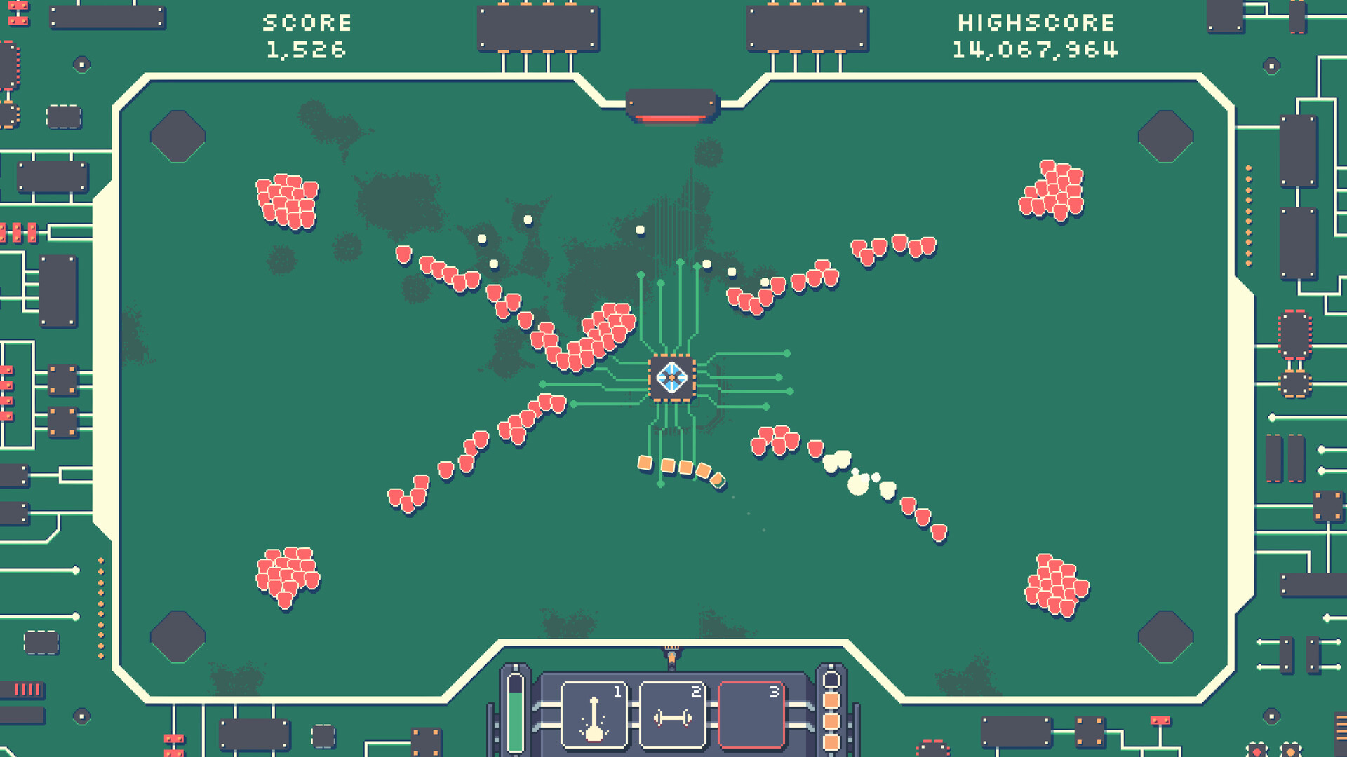 Core Breach is a twin-stick shooter inspired by games like Snake and Geometry Wars, hand drawn in a pixel art style with roguelike elements. You play as a Trojan worm virus infiltrating a CPU core to retrieve the secrets hidden within.