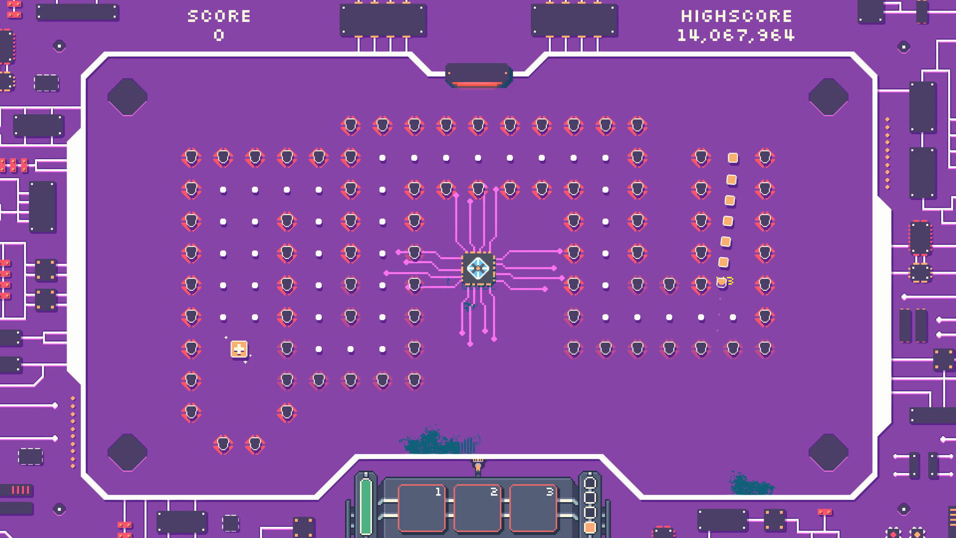 Core Breach is a twin-stick shooter inspired by games like Snake and Geometry Wars, hand drawn in a pixel art style with roguelike elements. You play as a Trojan worm virus infiltrating a CPU core to retrieve the secrets hidden within.