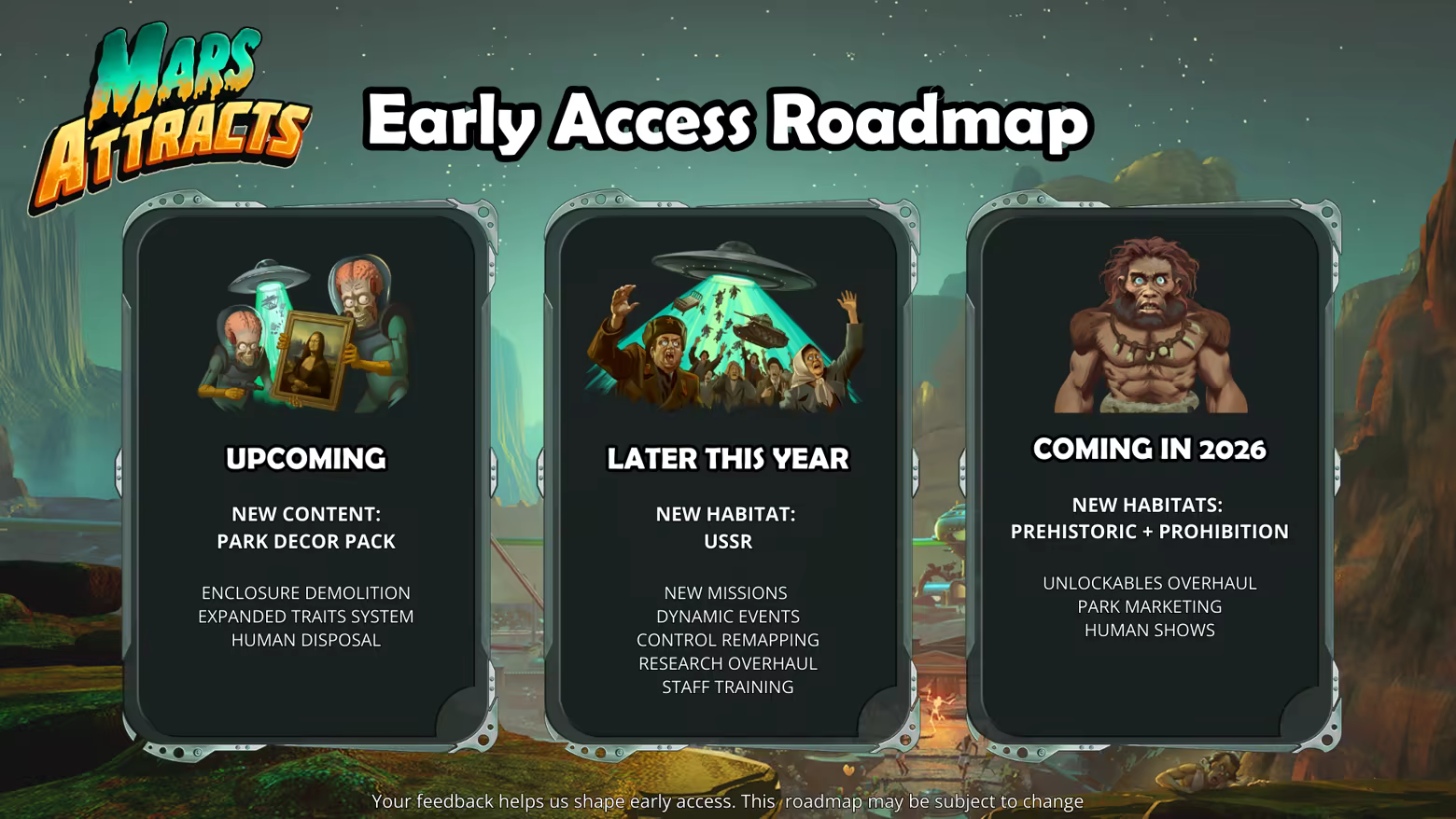 Mars Attracts is a theme park management game set on Mars. Play as the devious Martians from the cult-classic universe of Mars Attacks™ and build your amusement park empire, abducting humans from across history to display in customizable enclosures for the entertainment of curious Martian guests. Study humanity in their natural habitat, or subject them to whatever twisted experiments you can imagine!