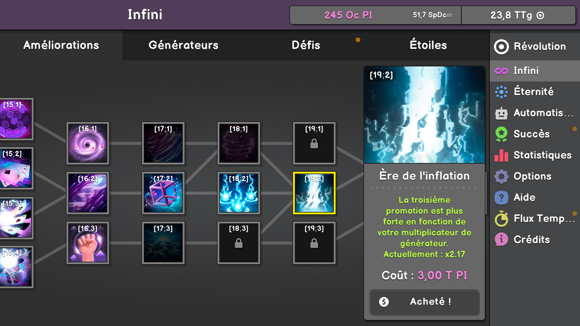 Lorsque vous atteignez ~1.79e308 score vous pouvez atteindre l'infini. Vous gagnerez des infinités et des points d'infini. Avec ces points vous pourrez acheter différentes améliorations qui boosteront votre progression.