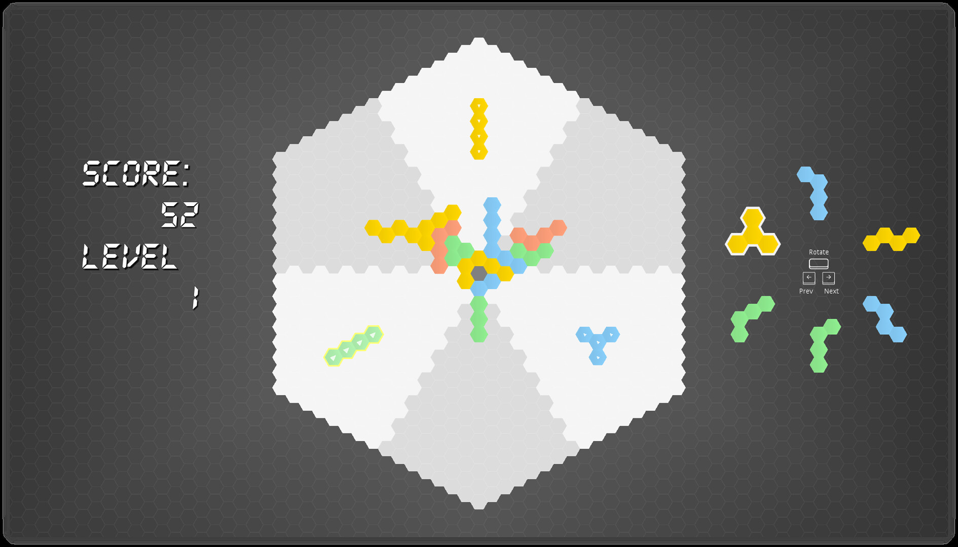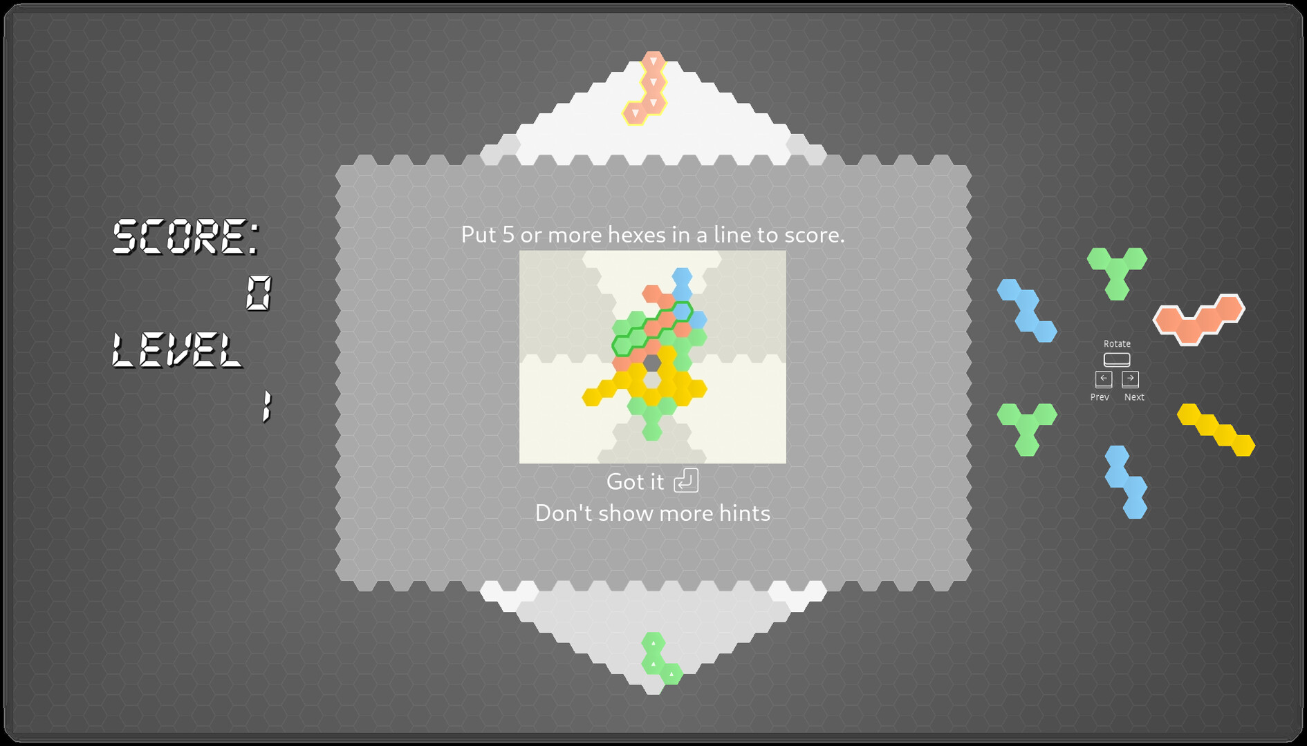 Hexagons are falling from all directions! Move them around to form lines and make them vanish into points. How high can you score before they pile up too high?