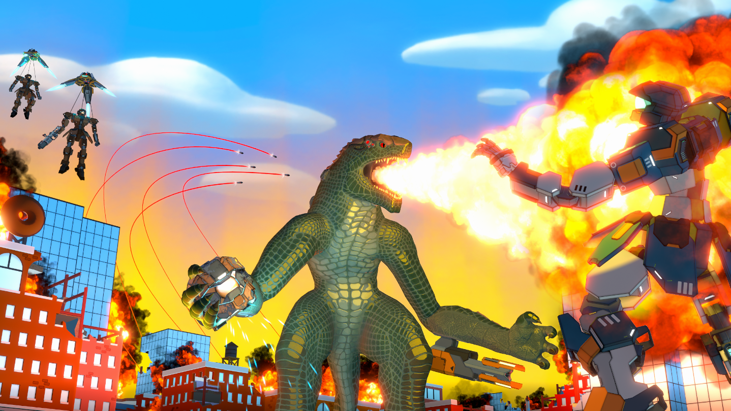 Devastate a fully-destructible city in VR as a giant monster. Battle mechs using your various breath, ranged, and melee weapons—including fire breath, gravity cannon, and lock-on missile pods.