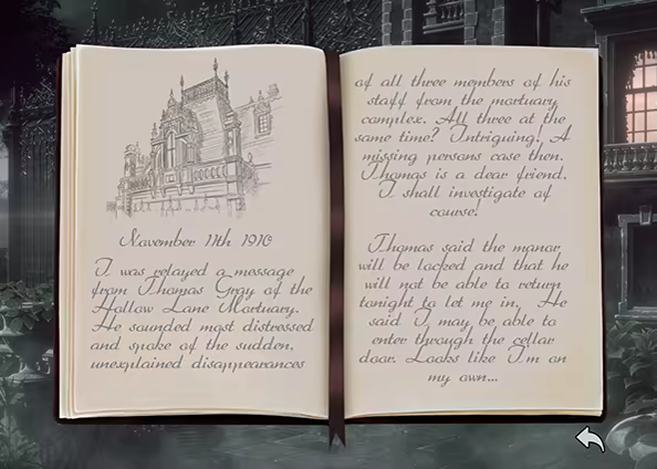 It is November 11th 1910 and Edward receives a call for help from his Father in Law Thomas Gray of the Hollow Lane Mortuary. It seems that all of the mortuary staff have vanished without a trace, all three at the same time! Edward travels to the mortuary to investigate what he assumes to be a missing persons case, he will soon find out that there is much more to the disappearances.