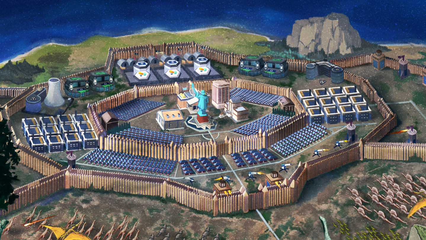 Building a massive colony is essential. Construct sprawling defences, set up vast production lines, and establish powerful grids to fuel your outposts. Each structure adds strength as you prepare to face relentless dinosaur swarms.